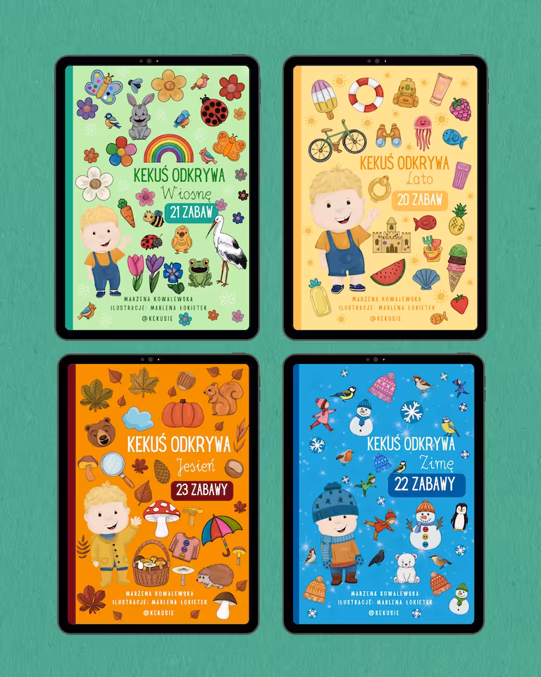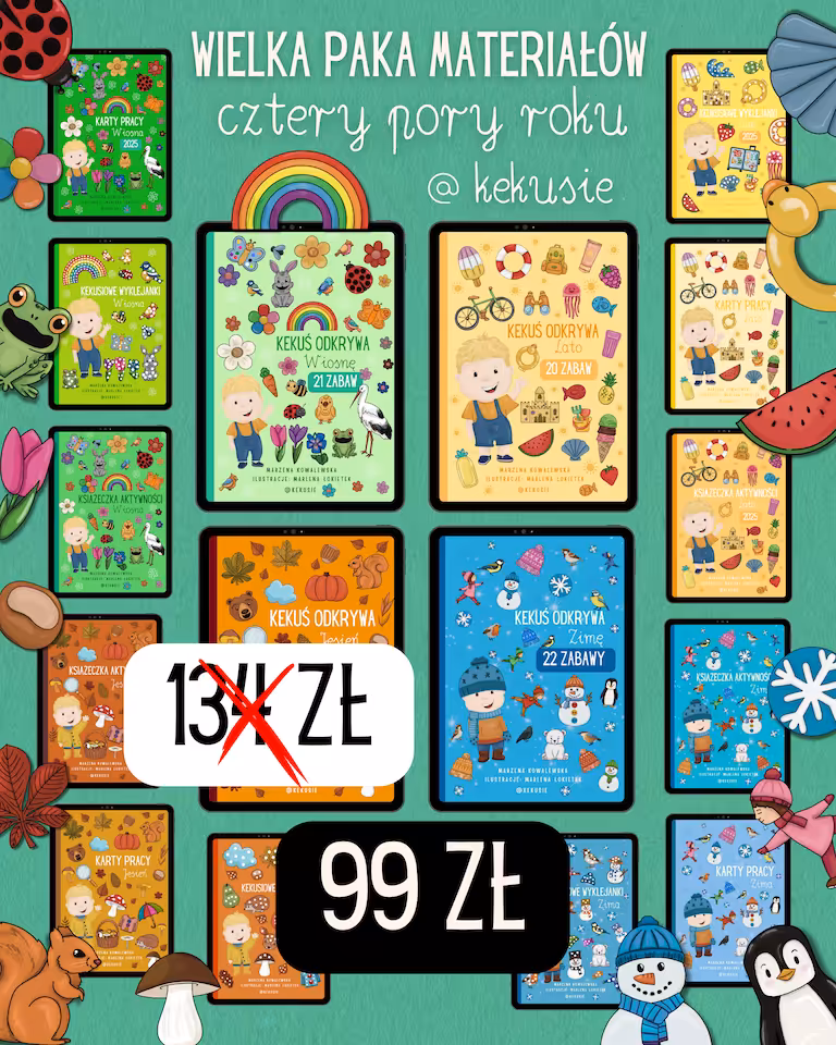 Pakiet materiałów "CZTERY PORY ROKU" to zestaw aż 16 e-książeczek z materiałami do zabawy i nauki przez zabawę dla dzieci w wieku przedszkolnym i wczesnoszkolnym! <3