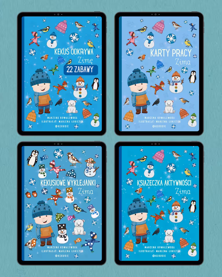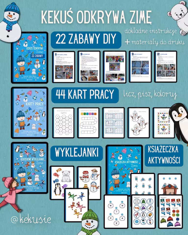 Pakiet materiałów "KEKUŚ ODKRYWA ZIMĘ " to zestaw aż 4 e-książeczek z materiałami do zabawy i nauki przez zabawę dla dzieci w wieku przedszkolnym i wczesnoszkolnym na ZIMĘ <❄️❄️