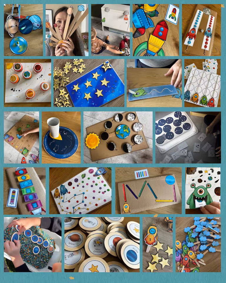Stworzyłam ten pakiet z myślą o dzieciach w wieku przedszkolnym, by z radością i ciekawością poznawały świat kosmosu. Wszystko poprzez zabawę, ruch, działanie i kolorowe materiały do samodzielnego przygotowania.